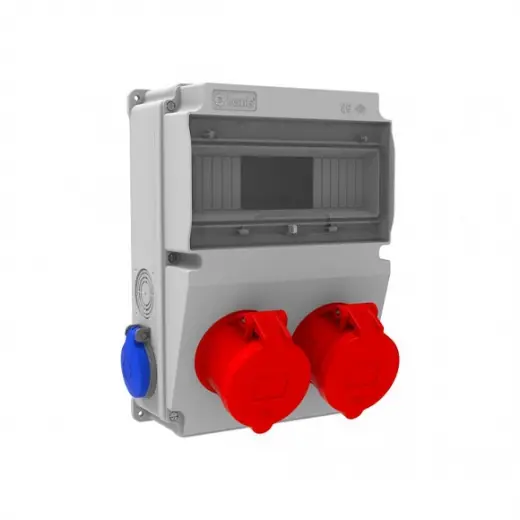 5x32A 2 Adet Ön 1x16 2 Adet Yan Prizli Kombinasyon, Ön kısmında 2 adet 5x32A değerinde makina prizi, yan kısmında 2 adet 1x16A değerinde kapaklı pano prizi bulunur.